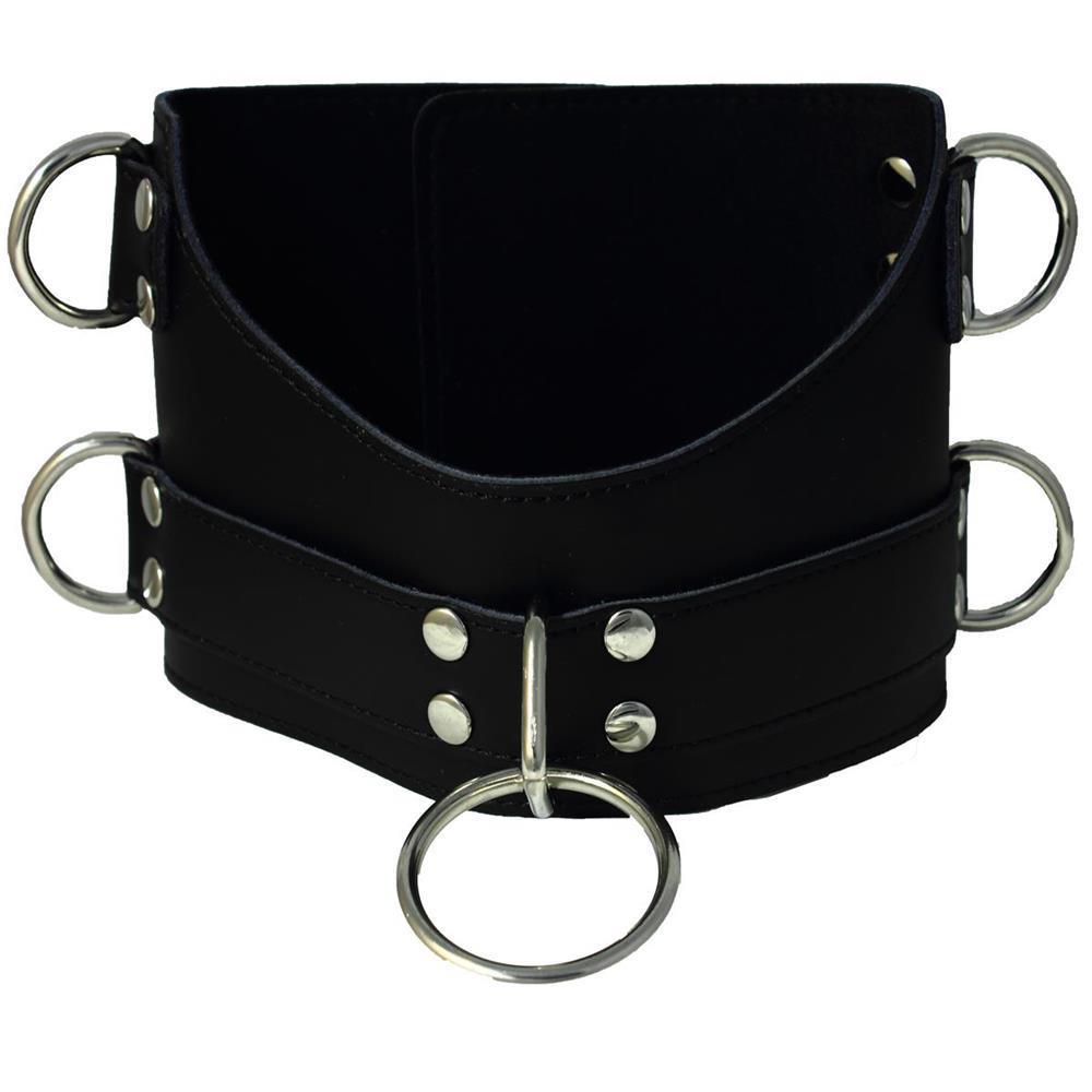 Breites Halsband, breite Halsfessel mit Verjüngung, 4 D-Ringen seitlich und einem Ring an der Vorderseite.