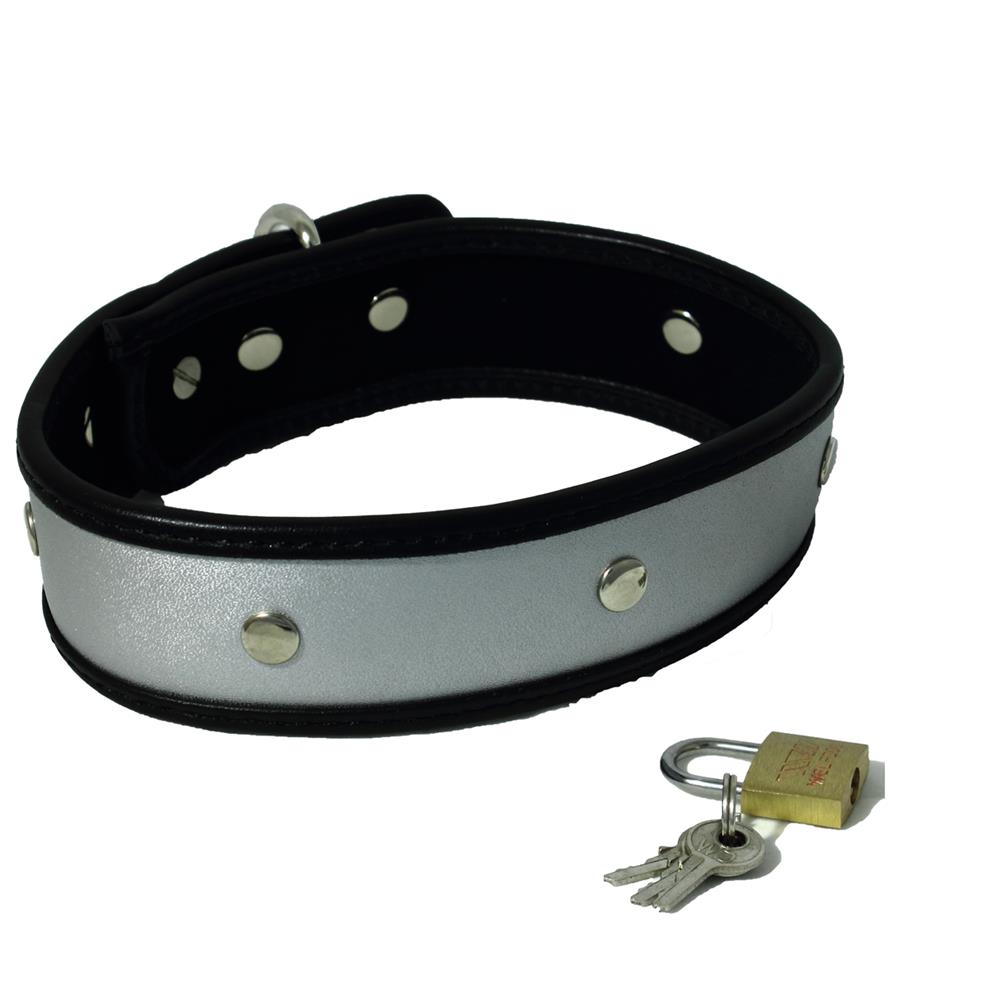 Abschließbares Halsband in silber/schwarz, mit Nieten verziert und D-Ring auf der Rückseite.