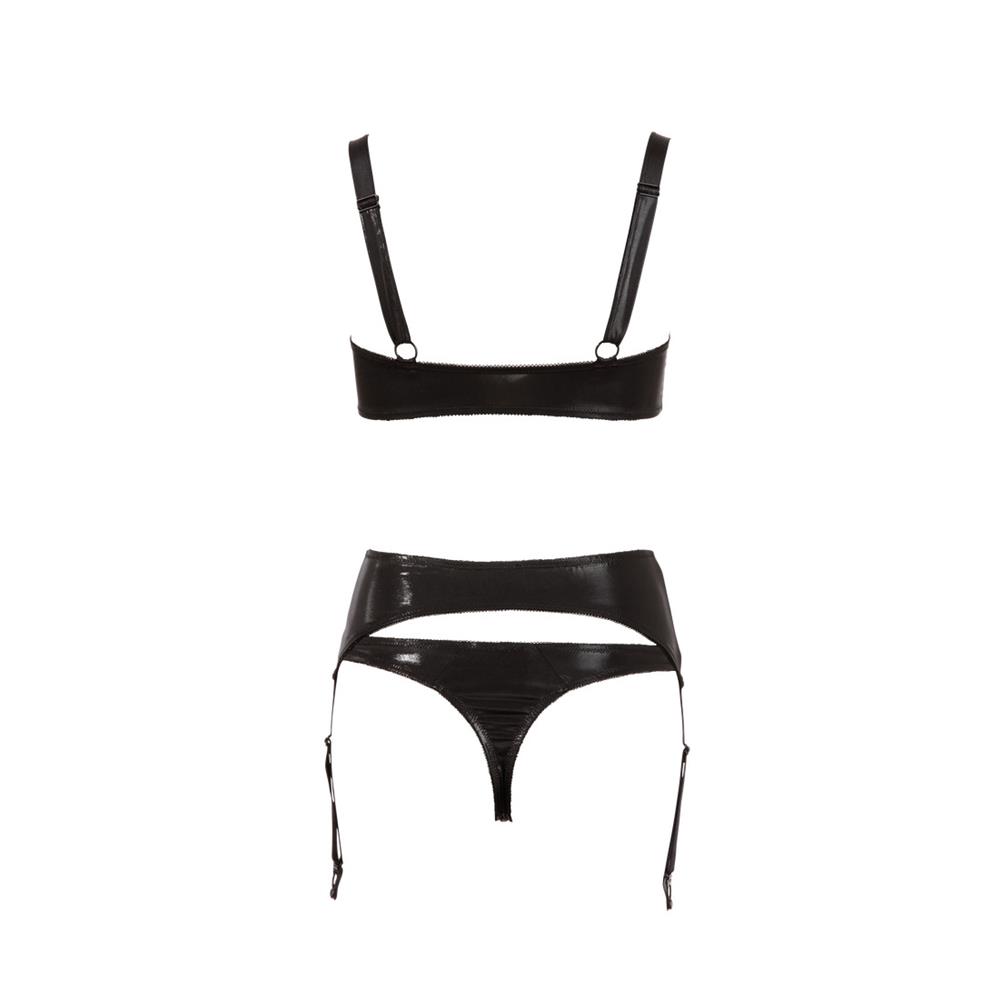 Bügel-BH mit Häkchenverschluss in der Front inklusive Strapsgürtel mit Hakenverschluss vorne und 4 Strapsen. Träger und Strapse verstellbar. Inklusive String. Leicht glänzendes Schwarz. 90% Polyamid, 10% Elasthan.