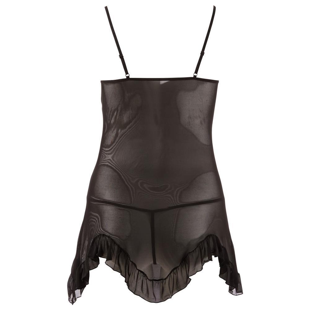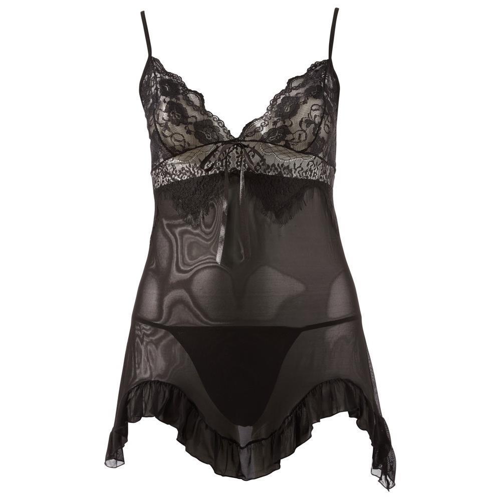 Schwarzes, leicht ausgestelltes Negligé mit Spitzen- und Rüschenverzierung.