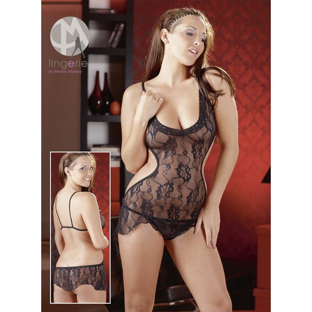 Dessous-Kleidchen und String aus schwarzer, weicher Effekt-Spitze.