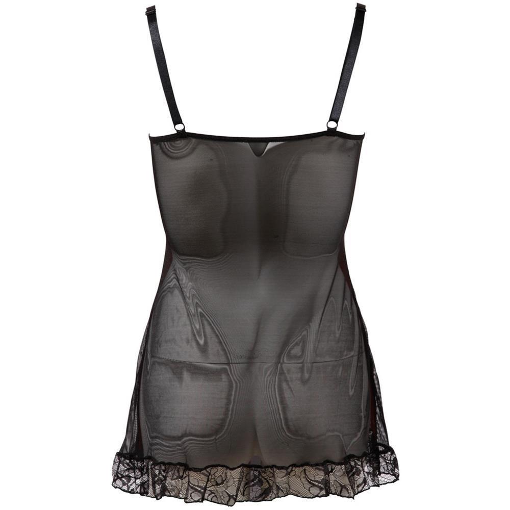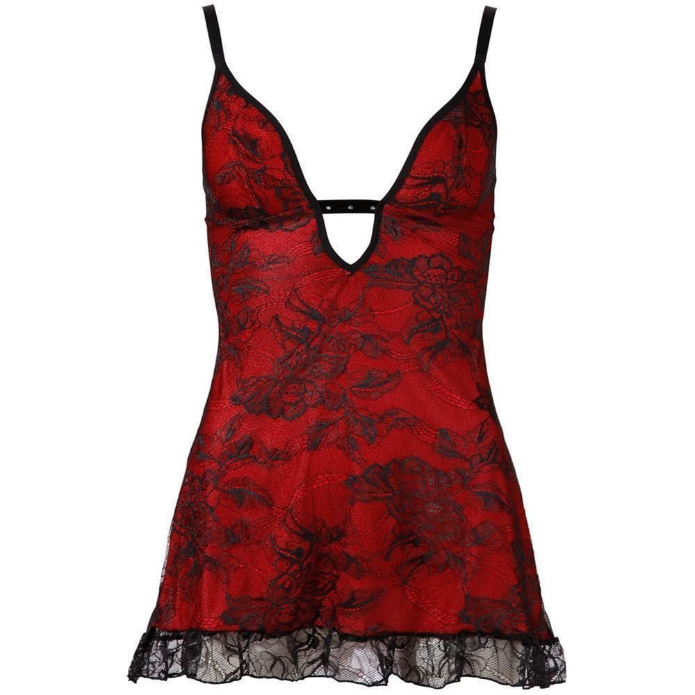 Leicht ausgestelltes Minikleid aus rotem Satin mit schwarzem Spitzenüberzug und zarter Rosenstickerei. Mit Strasssteinverzierung am Dekollete und verstellbaren Trägern. Mit Rundum-Rüschenverzierung und transparentem Powernet hinten. 90% Polyamid, 10% Elasthan.