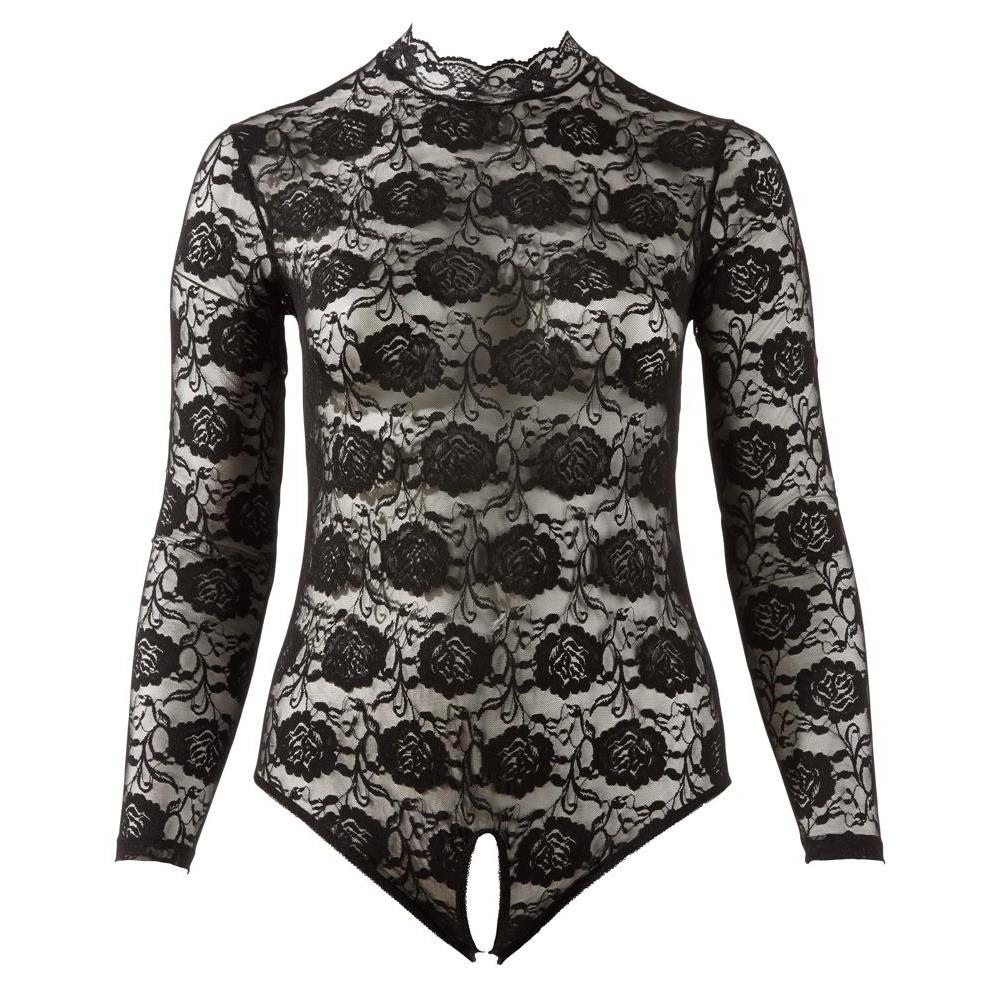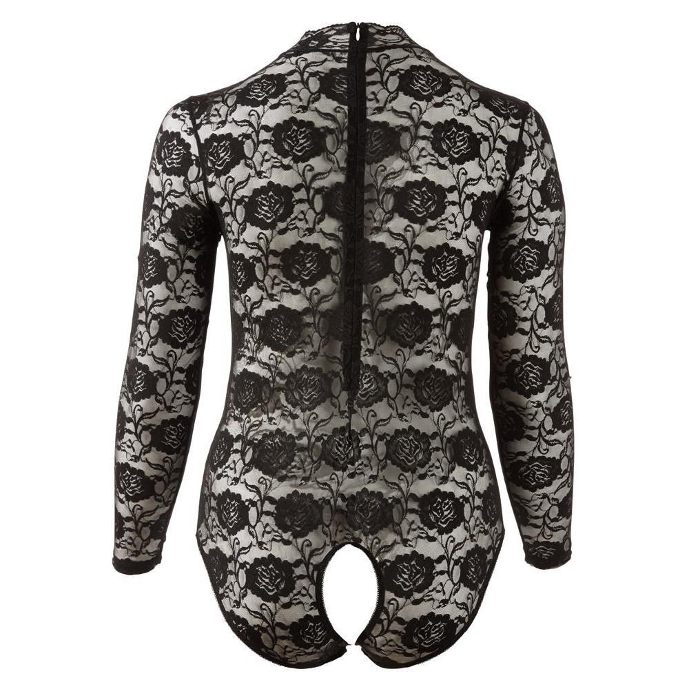 Body mit langem Arm, kurzem Stehkragen und offenem Schritt. Ganz und gar aus Spitze. Schwarz. 90% Polyamid, 10% Elasthan.