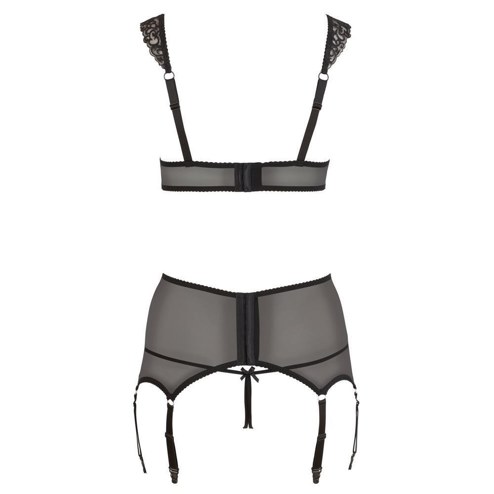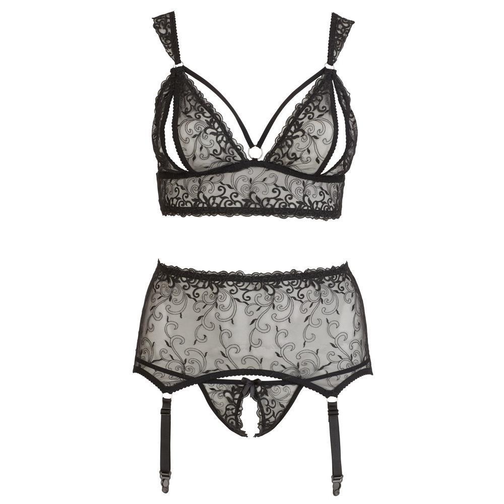 3-teiliges Straps-Set aus zartem Mesh mit aufwendiger Stickerei vorne. Im Rücken aus elastischem Powernet für eine perfekte Passform und maximalen Tragekomfort. Der Longline-BH verführt mit aufregend geschlitzten Cups und verzierten Trägern. Ein silberner Zierring und sinnliche Riemen-Details setzten das Dekolleté gekonnt in Szene. Der passende Strapsgurt ist taillenhoch geschnitten und verfügt über 6 verstellbare Strapsen. Dazu lockt der String mit einem einladend offenen Schritt.