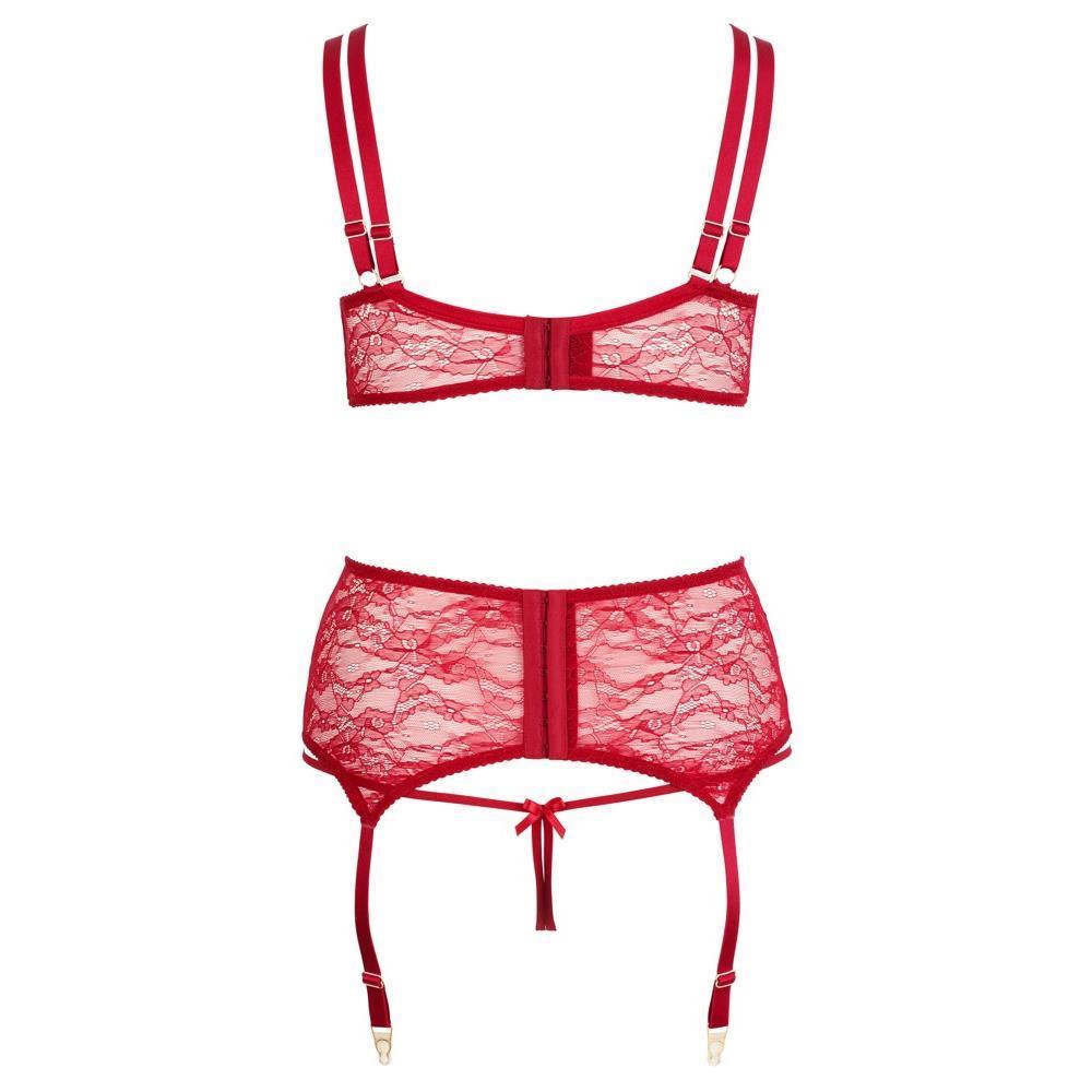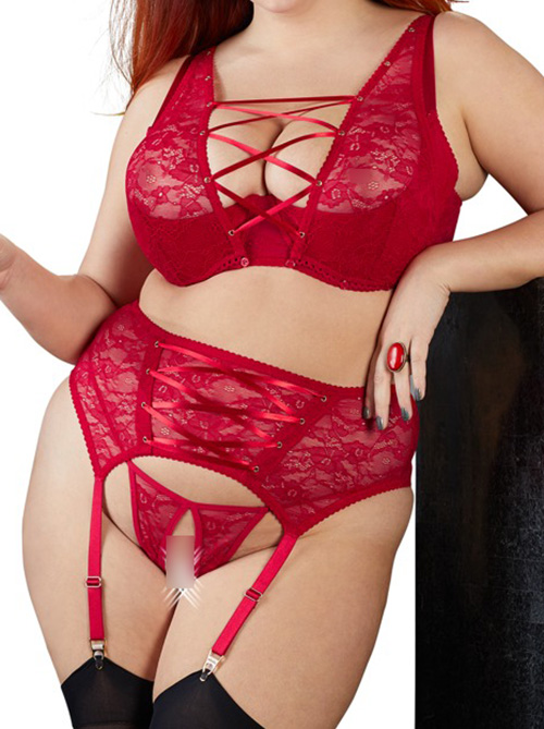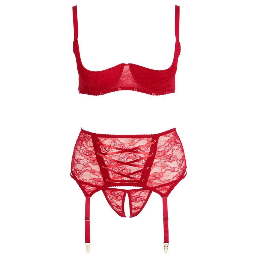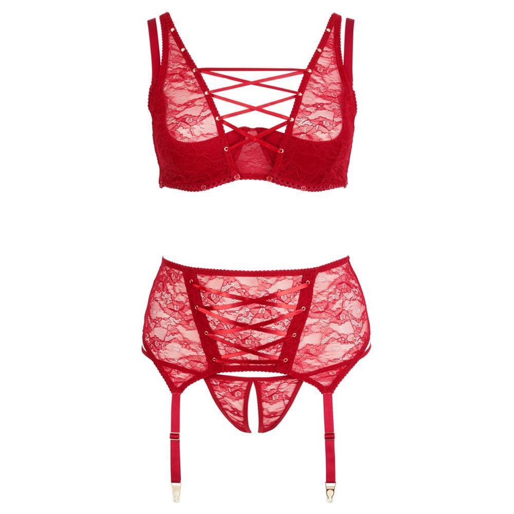 3-teiliges Straps-Set aus roter Spitze: Bügel-BH mit seitlichen Stäben, Strapsgürtel mit dekorativer Front-Schnürung und String ouvert.