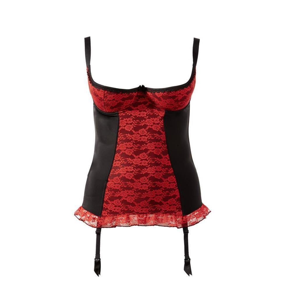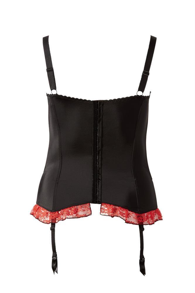 Eine hochwertig verarbeitete schwarze Corsage mit kurzen Stäbchen, Bügel-Cups, breiten, verstellbaren Trägern und verstell- und abnehmbaren Strapshaltern.