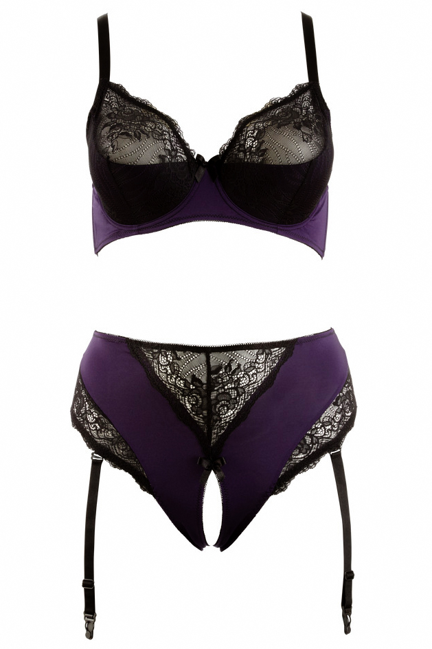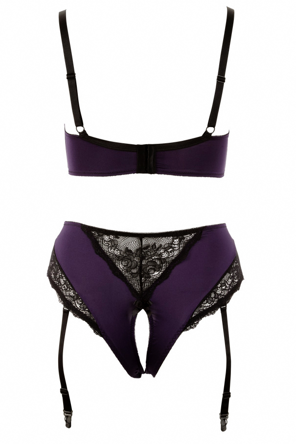 Bügel-BH mit unterlegten Spitzencups, verstellbaren Trägern und Häkchenverschluss hinten. Hoch geschnittener Slip mit offenem Schritt und vier verstell- und abnehmbaren Strapshaltern. Kombination aus lilafarbenem Stoff mit schwarzer Spitze. 94% Polyester, 6% Elasthan, Spitze 90% Polyamid, 10% Elasthan.