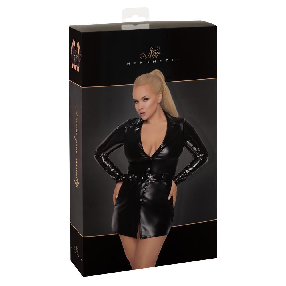 Extra kurzes Mantelkleid von Noir Handmade Curves komplett im schwarzen edlen Powerwetlook. Figurnah geschnitten im tief ausgeschnittenen Mantel-Styling mit langem Arm, stilechtem Reverskragen, durchgehender Duckknopfleiste vorne und Bindegürtel. Rundum elastisch und passformsicher für maximalen Tragekomfort.