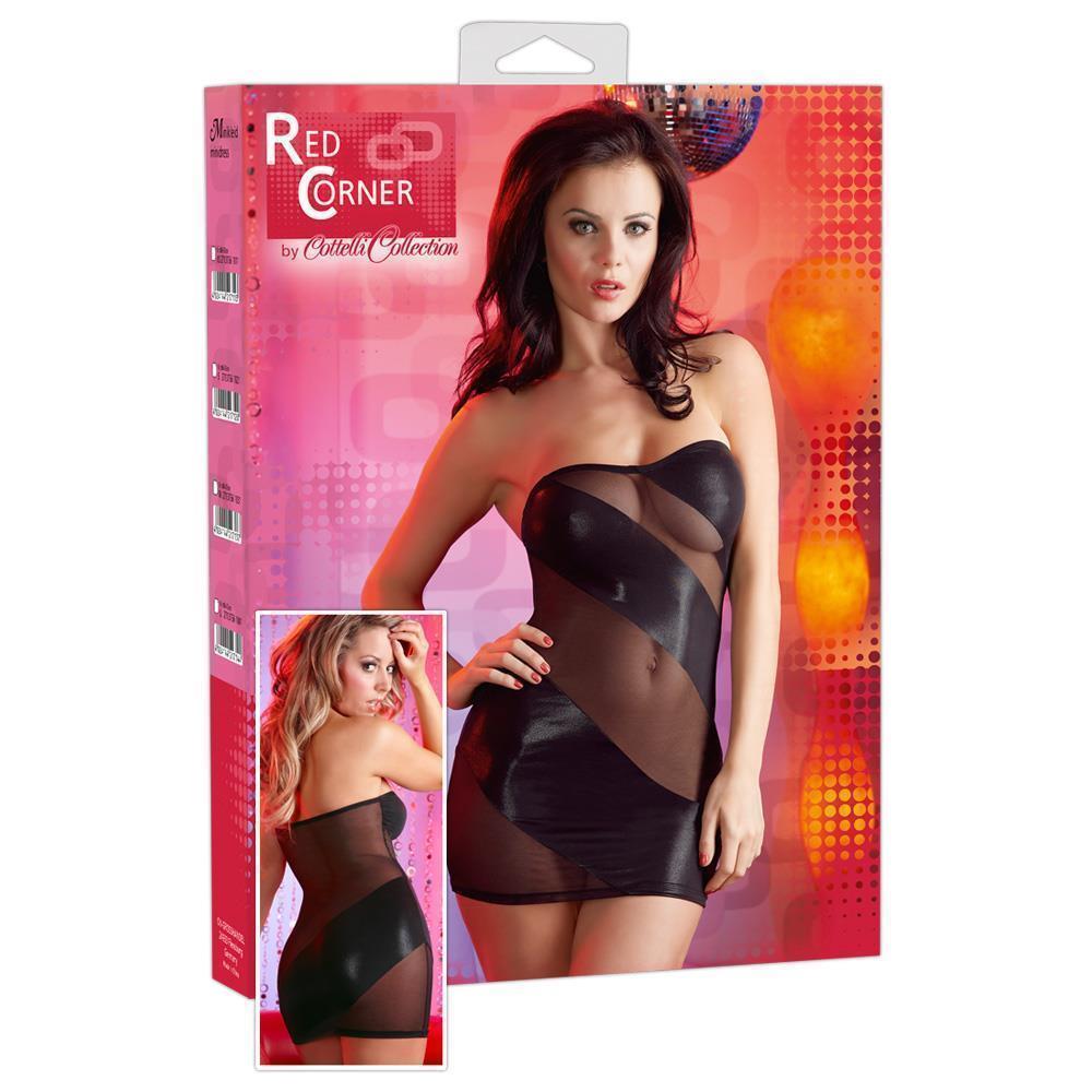 Trägerloses Minikleid im raffinierten Design! Schwarzer Glanzstoff und transparente Powernet-Einsätze im schräg verlaufenden Wechsel. 90% Polyamid, 10% Elasthan.