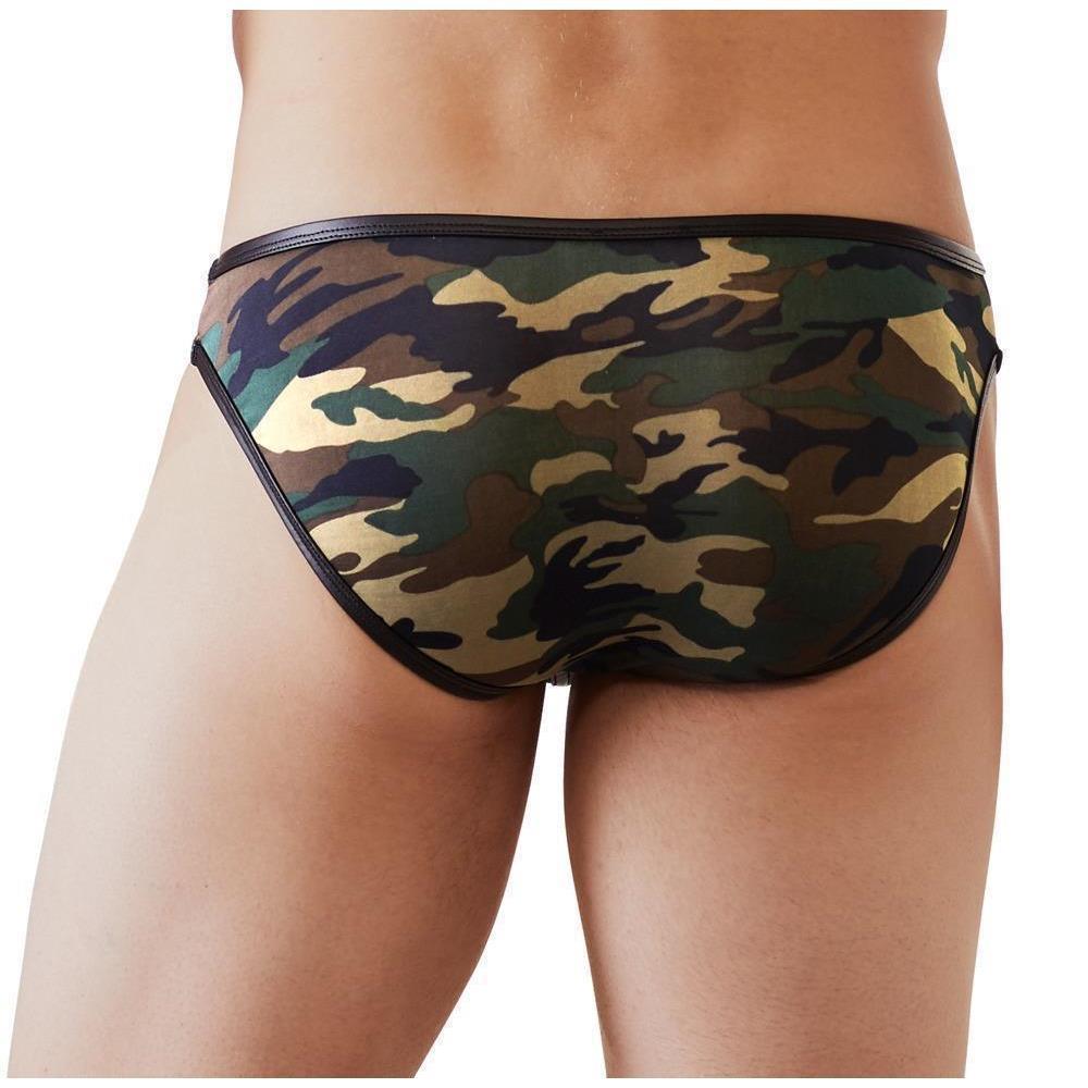 Weicher Mikrofaser-Slip im Camouflage-Look. Vorne am Beutel mit Nieten verziert. 95% Polyester, 5% Elasthan.